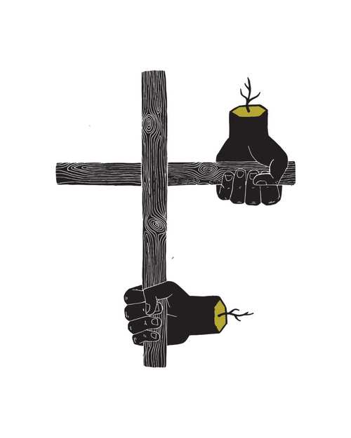 In this image we see two separate hands holding two separate pieces of wood, juxtaposed together to make the symbol of the cross. In Jesus’ journey to death, overcome with exhaustion from being beaten and forced to carry his own cross, He can no longer carry the burden laid